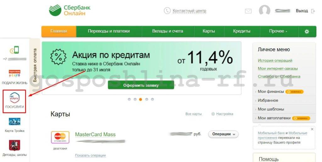 Для удобства пользователей Сбербанк предоставляет возможность перейти в поле оплаты госпошлины сразу из основного меню: