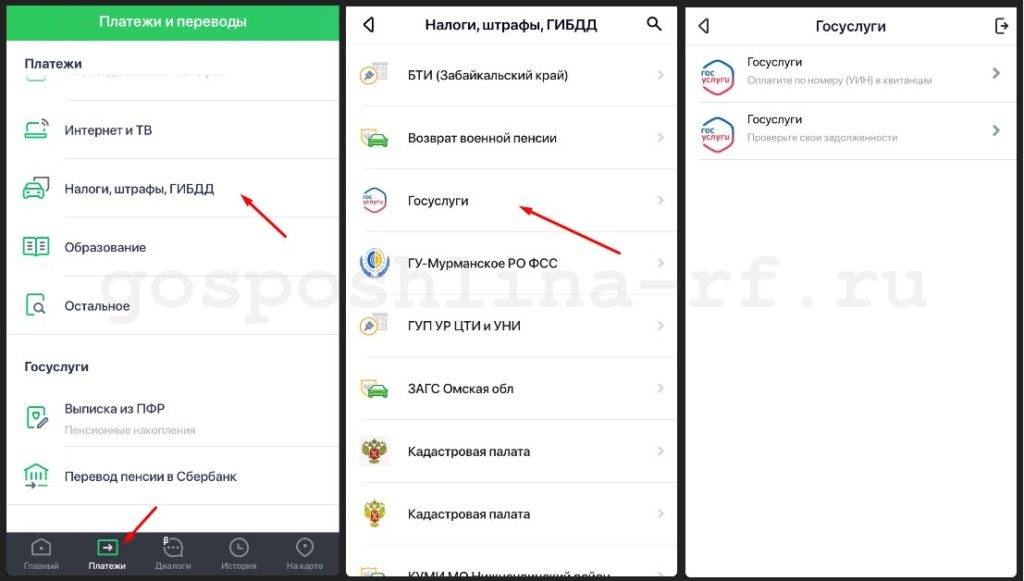 Оплатить госпошлину можно и через приложение Сбербанка. Для этого следует перейти во вкладку “Платежи”, затем в появившемся списке нажать пункт “Налоги, штрафы, ГИБДД” и далее перейти в раздел “Госуслуги”: