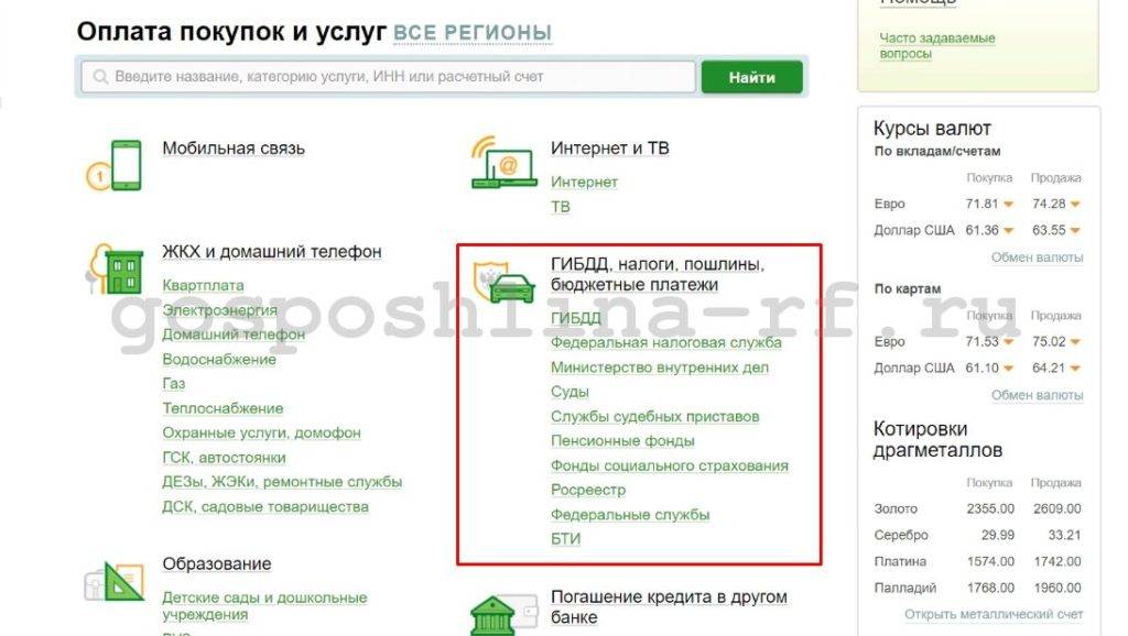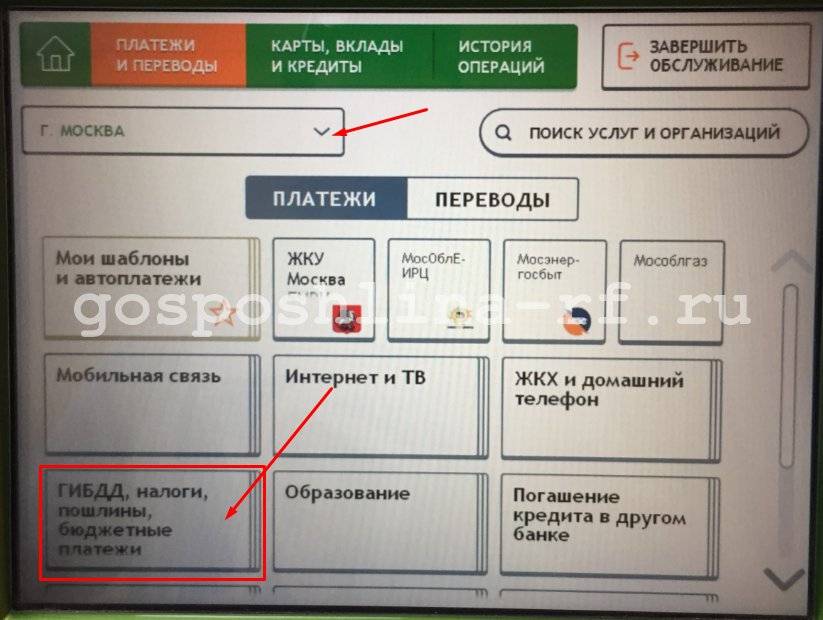 2. Выбрать в новом окне свой город, а в появившемся списке поле “ГИБДД, налоги, пошлины, бюджетные платежи”.