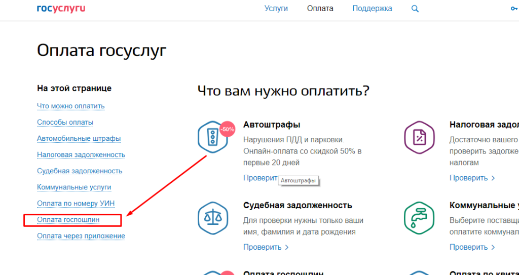 Затем следует перейти во вкладку, где предоставляется возможность оплаты госпошлины, ввести в форму запрашиваемую информацию, осуществить безналичный расчет и распечатать чек, подтверждающий проведение операции.