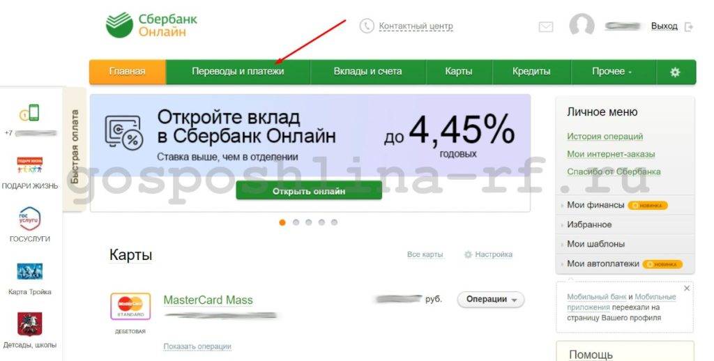 1. В первую очередь следует авторизоваться в системе онлайн-банкинга и зайти в личный кабинет. Затем нужно перейти в меню “Переводы и платежи”.