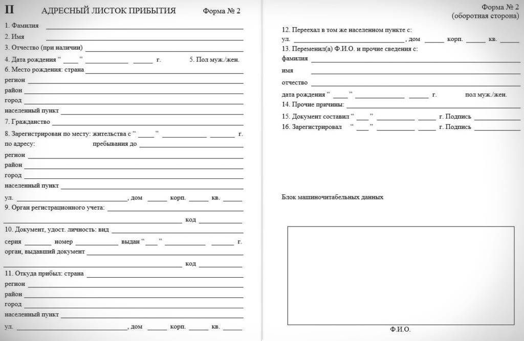 - Адресный листок прибытия – унифицированная форма №2. Бланк можно скачать и заполнить обязательно в 3 экземплярах.