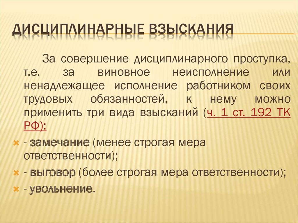 Под дисциплинарным взысканием подразумевается наказание, налагающееся за дисциплинарный проступок, то есть за случай, когда вследствие виновных действий сотрудника не исполнены или исполнены в ненадлежащем виде его функциональные обязанности.