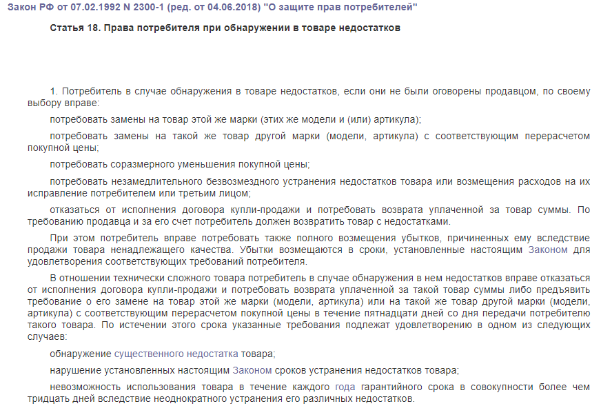 Если неисправность произошла не по вине потребителя, то согласно 18 параграфу закона «О защите прав потребителя» он может потребовать одно из следующего: