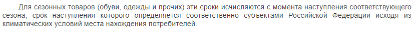 Однако если предмет предназначен для сезонного использования (в первую очередь это касается одежды и обуви), время начинает отсчитываться с первого дня наступления конкретного сезона – например, зимы. Это время определяется по-разному, в зависимости от климатических условий того или иного региона РФ.