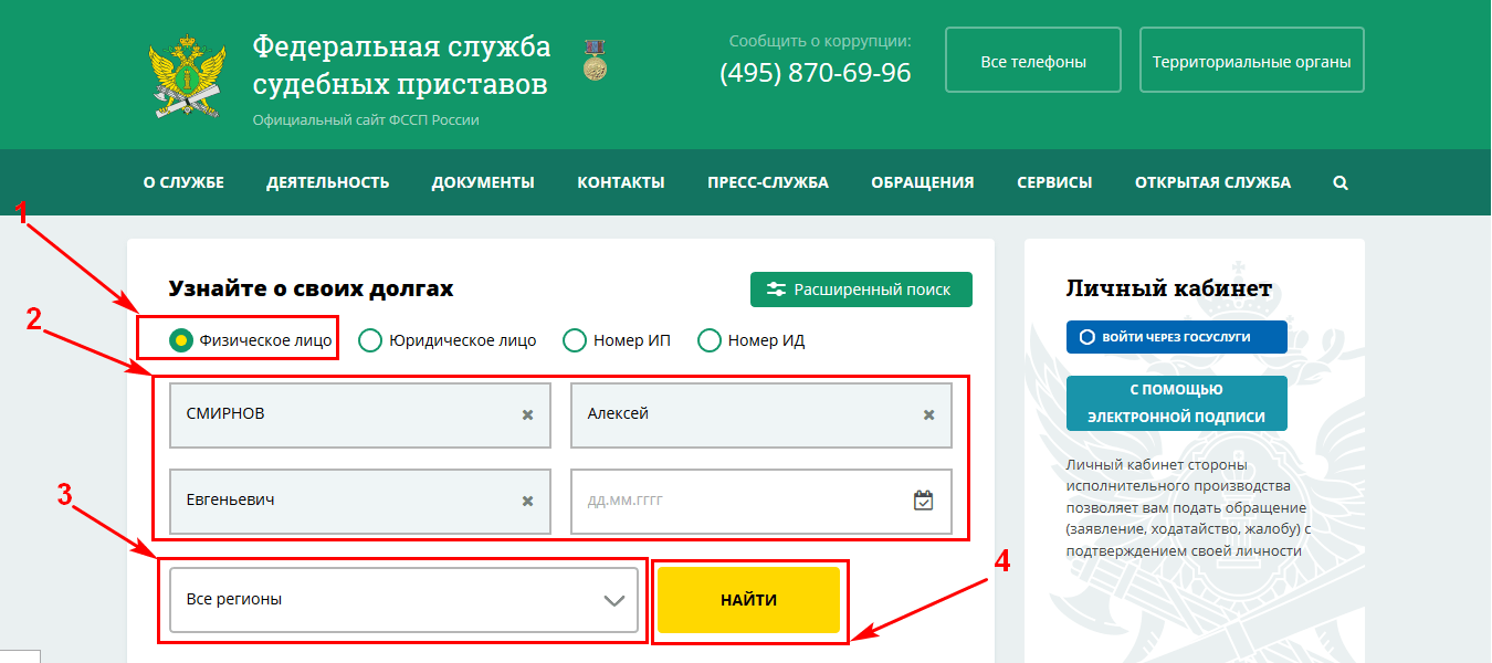 • Путём ввода минимального количества личных данных – ФИО и регион прописки должника, однако чаще всего вводить отчество нет необходимости.