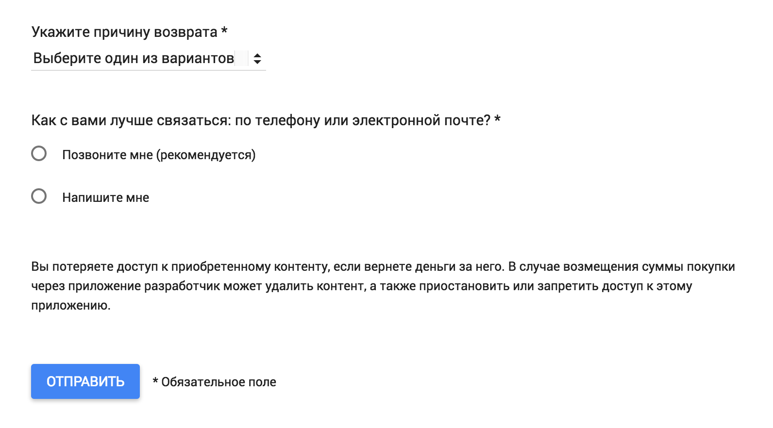 Если в два часа не уложились, то вернуть деньги можно через форму на сайте Гугла. Этот способ работает в течение двух дней после покупки. Так можно вернуть деньги за приложения, встроенные покупки и подписки. Гугл попросит указать причину возврата. Пункты такие же, как на сайте «Эпл», — не запутаетесь.