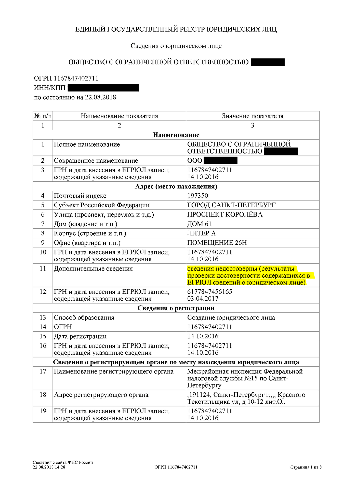 А так выглядит отметка о недостоверности адреса. По мнению налоговой, организация не находится по этому адресу