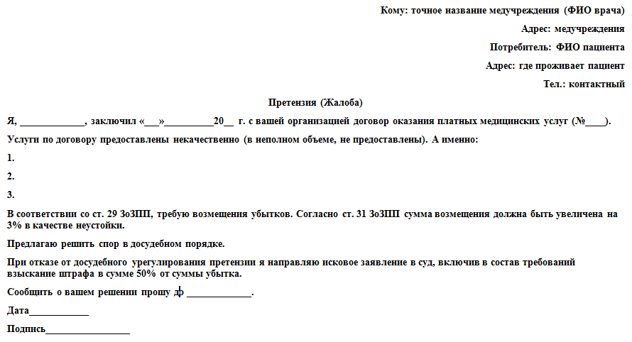 Если доктор нарушил условия договора, то необходимо предъявить претензии: