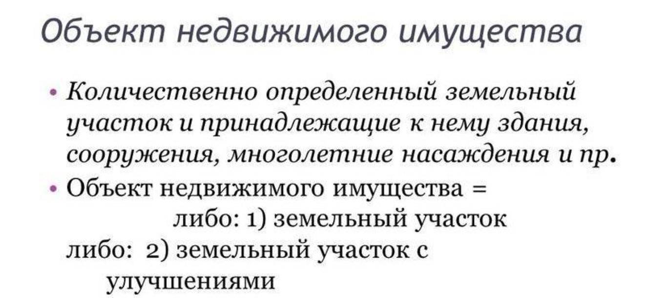 Под объектом недвижимости понимается, во-первых, предприятие в целом как имущественный комплекс, а во-вторых земельный участок, неотъемлемой частью которого могут быть: