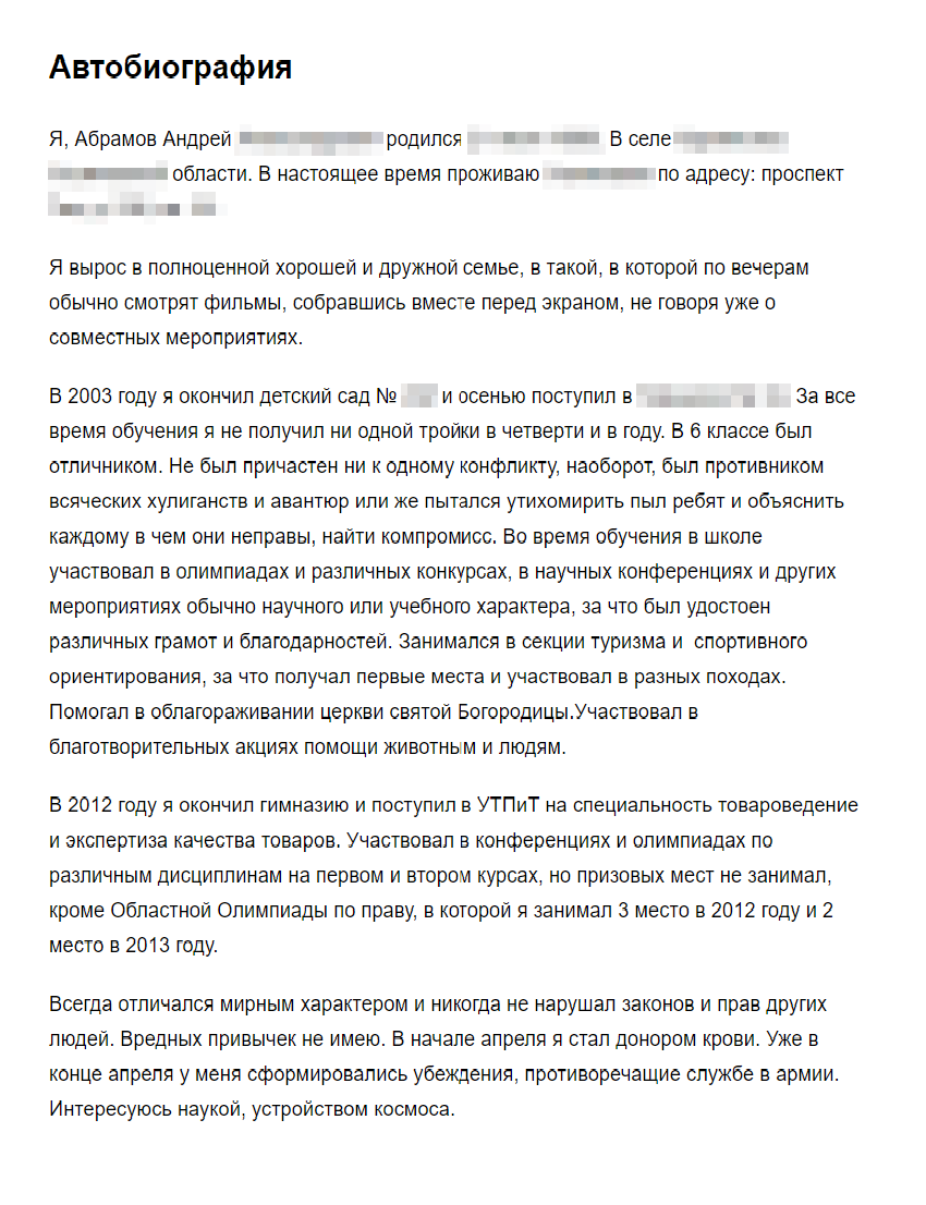 Мой опыт. Я серьезно задумался о военной службе в последнем семестре четвертого курса техникума. Перед началом призыва попытался сформулировать свое отношение к войне, убийствам и оружию. Ничего хорошего о военной службе сказать не мог и не могу сейчас. Не стоит делить несуществующие границы, а уж тем более за них умирать или убивать. Я убежден, что конфликты нужно решать мирным путем, а человеческая жизнь и свобода — самое ценное, что у нас есть. В своем заявлении я так и написал, а потом подтвердил это на заседании призывной комиссии.