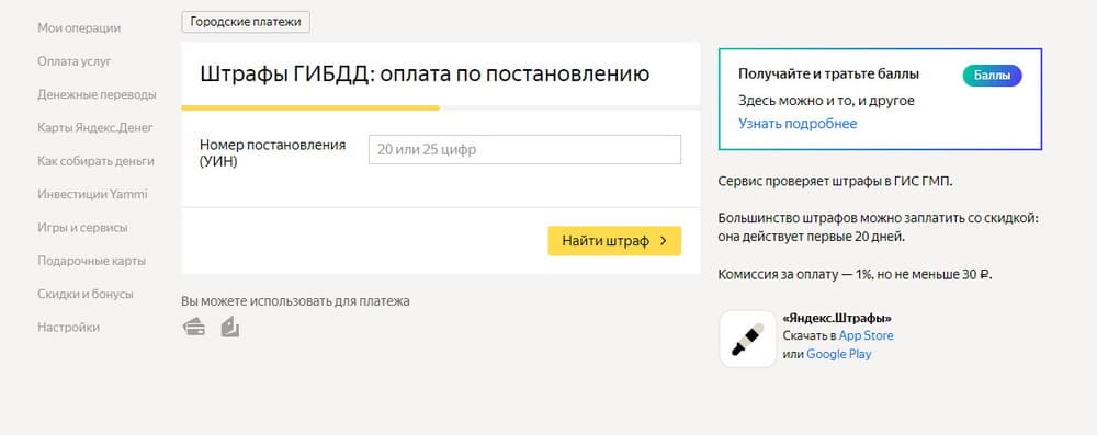 Также, хочется отметить один из популярных сервисов – Яндекс.Деньги. Вы можете осуществить поиск штрафов по водительскому удостоверению и СТС, а также осуществить платеж по бумажному постановлению.