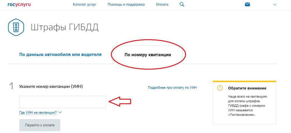 На главной странице в правом верхнем углу осуществляется автоматический поиск штрафов. Нажмите на них и выберете «По номеру квитанции».