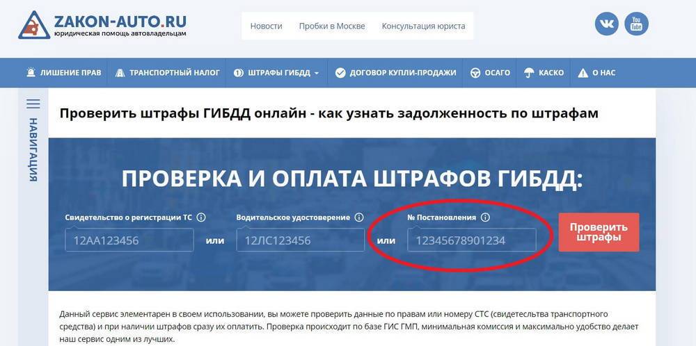 Рассмотрим возможность оплаты на нашем сайте. Вам не нужно регистрироваться, достаточно лишь указать УИН в поле «№ Постановления» и нажать на кнопку «Проверить штрафы».