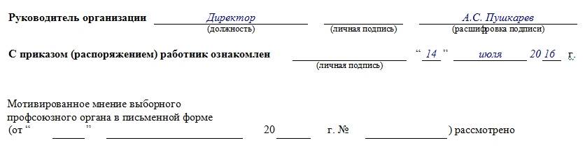 И уже после подписания руководителем организации, с приказом необходимо также под роспись ознакомить сотрудника. Если подпись сотрудника в данном документе будет отсутствовать, то сотрудник может в дальнейшем оспорить свое увольнение через суд.