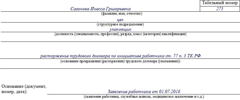 - в строку «Основания увольнения» запишите формулировку из ТК РФ полностью без сокращений — основание и номер части пункта и статьи, по которой происходит расторжение договора (те же сведения будут указаны в записи в трудовой книжке);