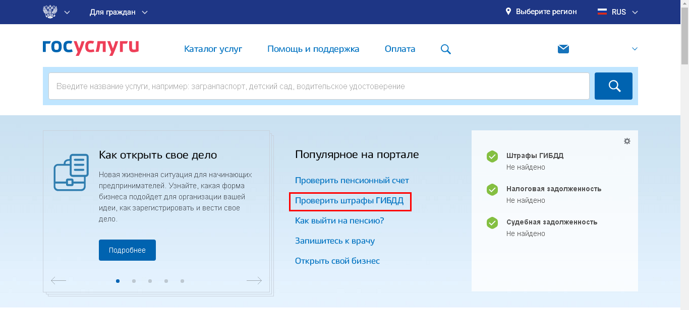 Есть такой сервис, который называется «Оплата государственных услуг». Здесь проверить задолженность можно по водительскому удостоверению или по номеру постановления.
