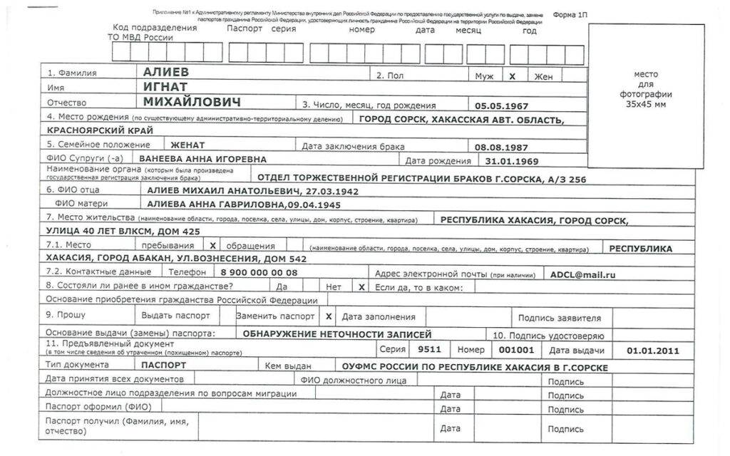 Для получения паспорта существует своя форма бланка – 1П. Заполнять ее не сложно. Можно использовать для этого компьютер, либо писать от руки ручкой с черными чернилами.