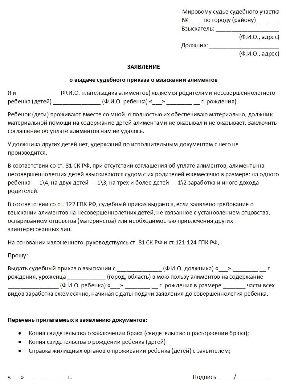 Заявление на выдачу судебного приказа о взыскании алиментов должно содержать следующую информацию: