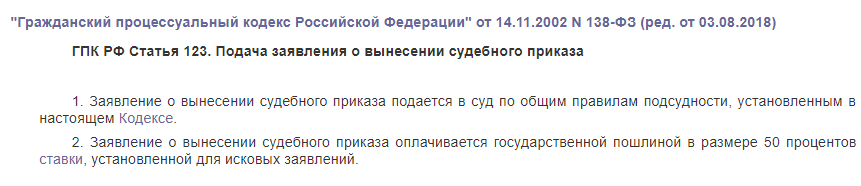 - ссылка на статью 122 ГПК РФ, где зафиксировано право обращения за судебным приказом;
