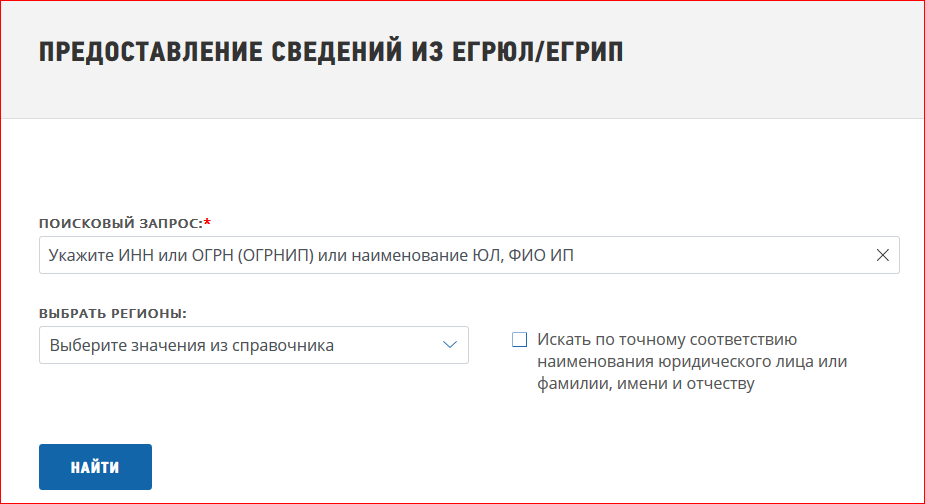 В этом случае достаточно просто зайти на официальную страницу ФНС, а именно – на портал ЕГРЮЛ https://egrul.nalog.ru/. Далее в окне с критериями поиска нужно уточнить, о какой именно организации идет речь: