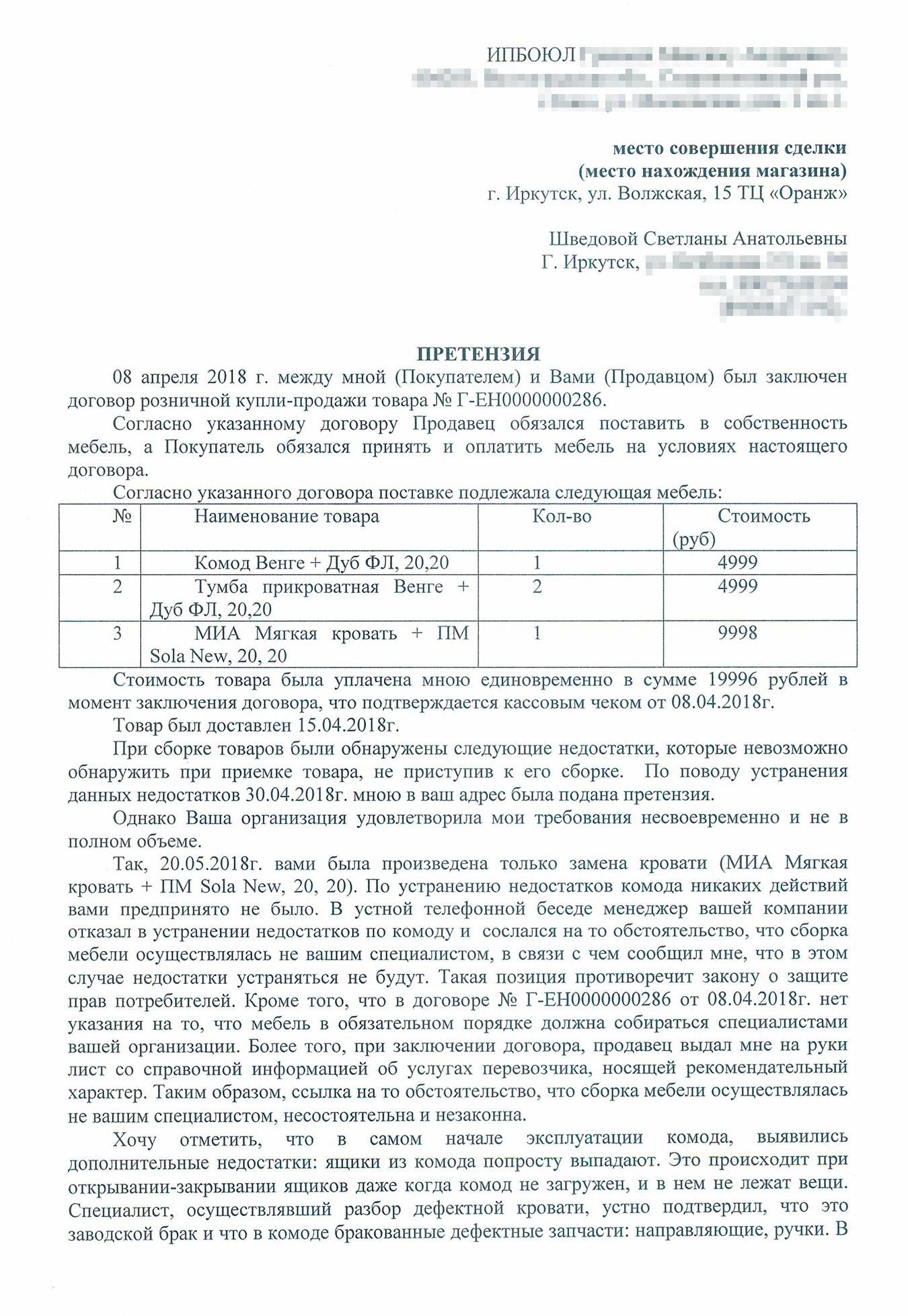 Для того, чтобы вернуть средства, уплаченные за некачественную мебель, следует составить письменную претензию, в претензии нужно обосновать причину возврата и указать требования покупателя (обмен, возврат, исправление недостатков и прочее). После чего следует: